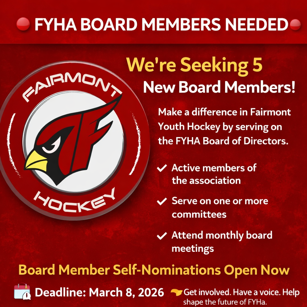 Practices: FYHA will follow the National Weather Service. If Martin County is under a Winter Weather Warning or Blizzard Warning during a scheduled practice, all practices will be canceled.